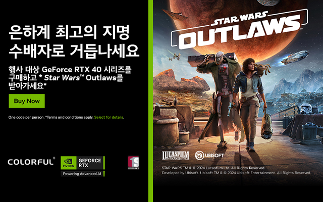 컬러풀 그래픽카드 공식 수입사, 주식회사 웨이코스(대표 고민종)는 엔비디아가 주관하는 ‘스타 워즈 아웃로 (Star Wars Outlaws)’ 게임 증정 프로모션을 “컬러풀 테크놀로지(COLORFUL Technology Co. LTD)”와 함께 2024년 8월 20일부터 9월 19일까지 진행한다.